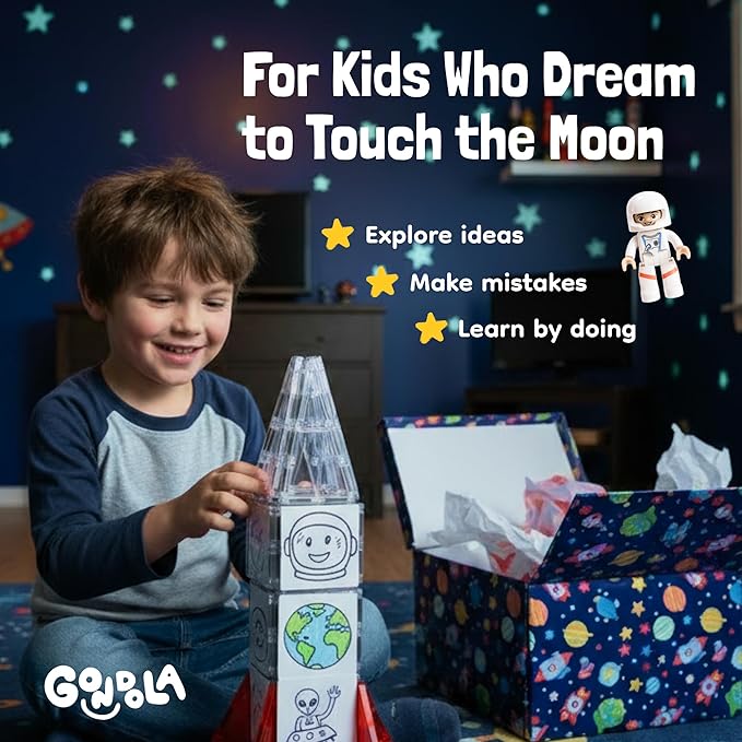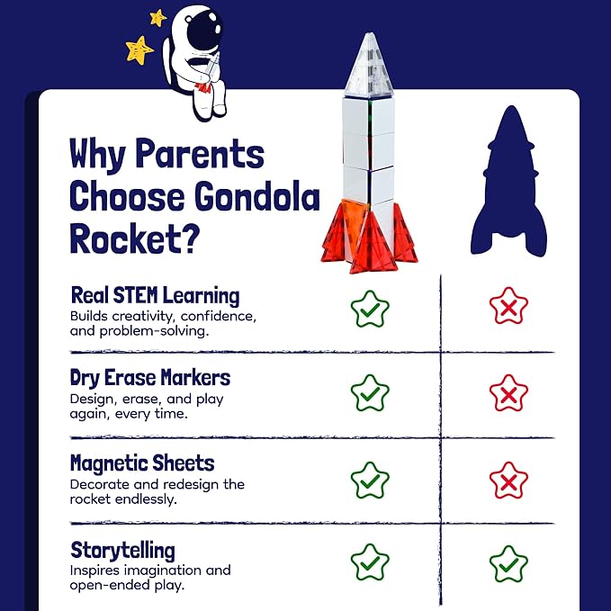 - Inspire Creativity: The Gondola DIY Magnetic Rocket Ship Building Set captivates young minds with its vibrant tiles and astronaut figure. This set, ideal for toddler boy toys, offers endless opportunities for creative exploration through interactive play